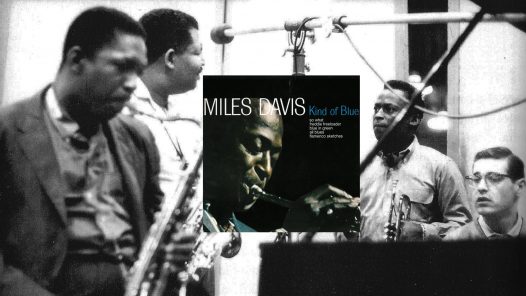 John Coltrane, Cannonball Adderley, Miles Davis y Bill Evans grabando el disco "Kind of Blue" - Carátula de "Kind of Blue".